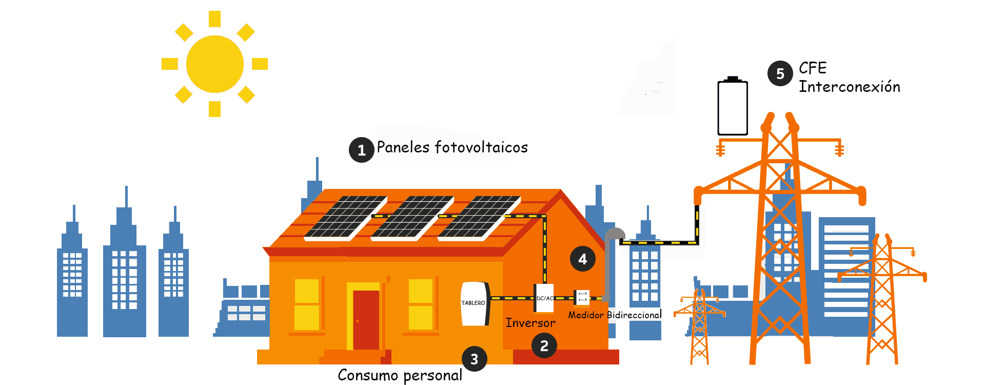 La interconexión con la red de CFE nos ayuda a tener un servicio ininterrumpido ya que el exceso de producción en la mañana se manda a CFE y en la noche lo recuperas .